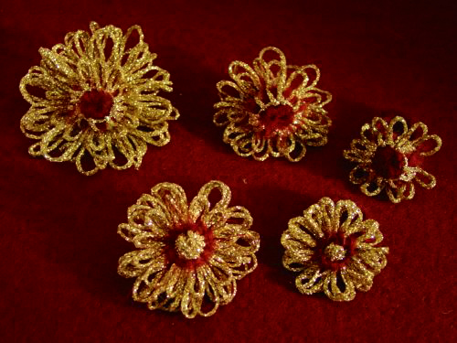 MATERIALGold-Lamé und PolyamidGRÖSSENMini: Ø 3,5 cmMaxi: Ø 5 cm Klein: Ø 3,5 cm / 1,5 cm hoch Mittel: Ø 4,5 cm / 1,5 cm hoch Gross: Ø 6 cm / 1,5 cm hoch (Einheitsgrösse für jede Hand)